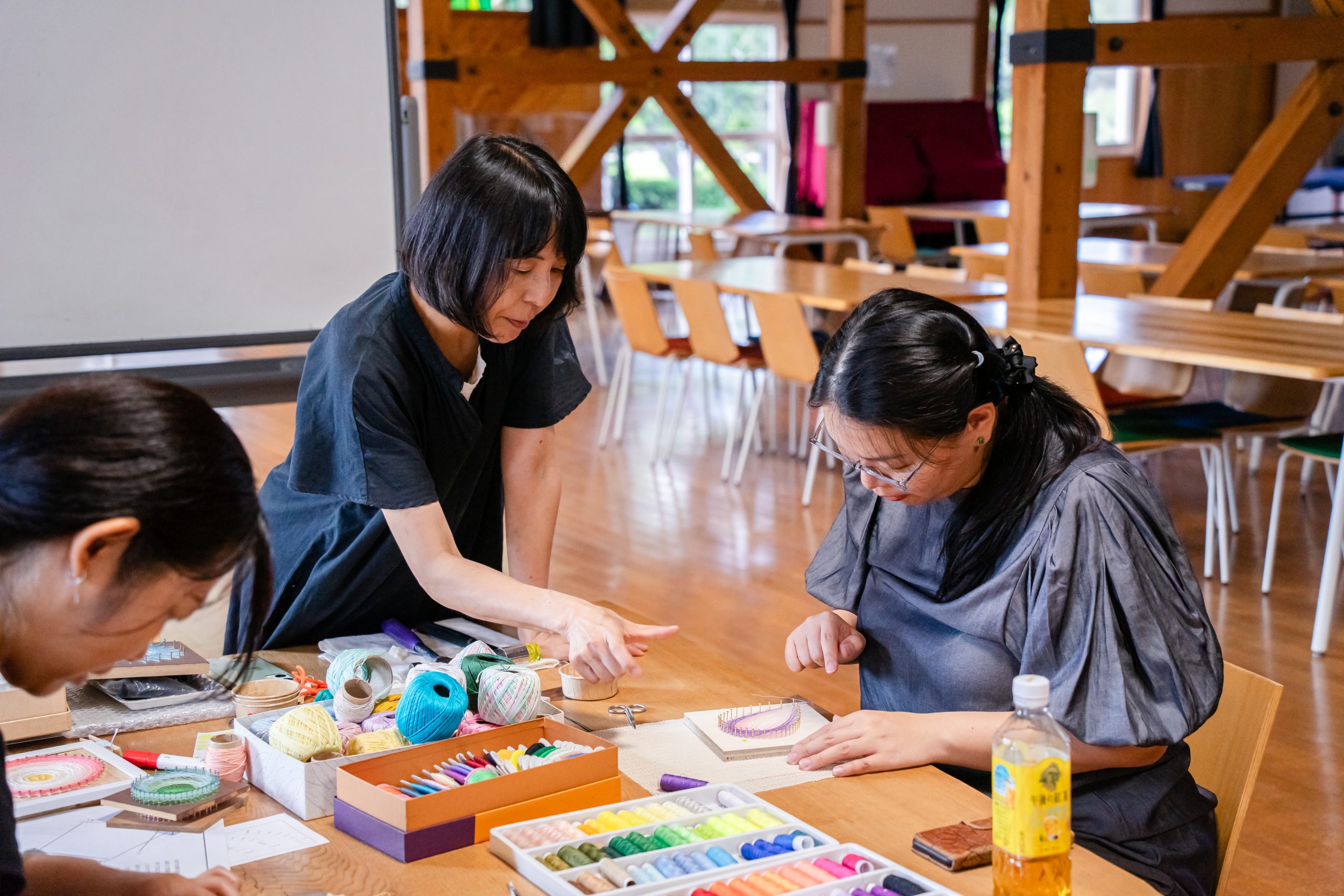 板にピンを打ち込んで好きな色の糸をかけて模様を作る糸かけ体験をしてみませんか。